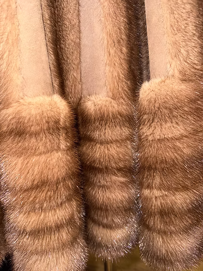 Kappan är tillverkad med genuint hantverk och stor precision, vilket framhäver minkpälsens naturliga lyster och silkeslena känsla. Den mjuka och lätta konstruktionen gör plagget både bekvämt och elegant att bära.